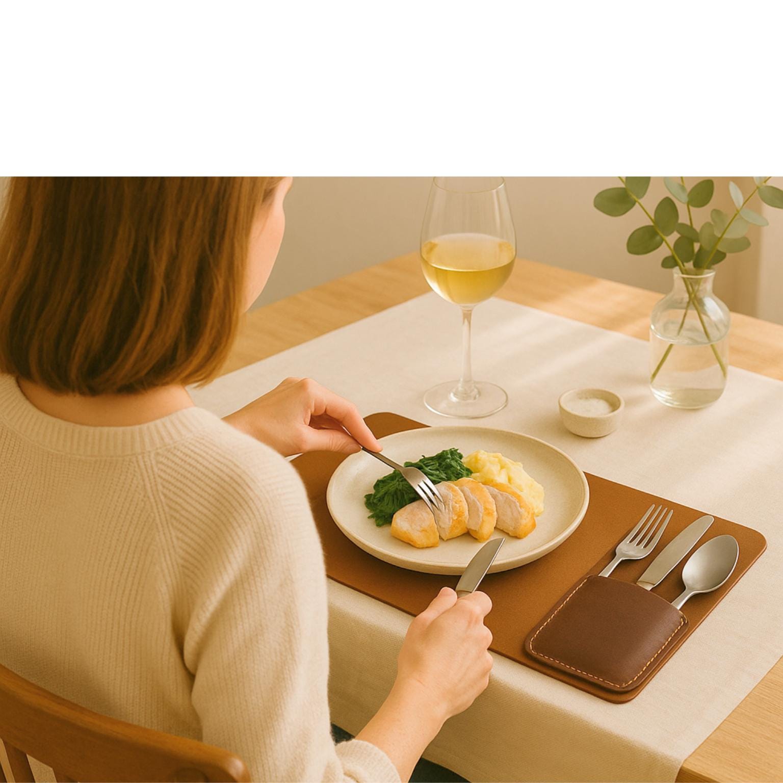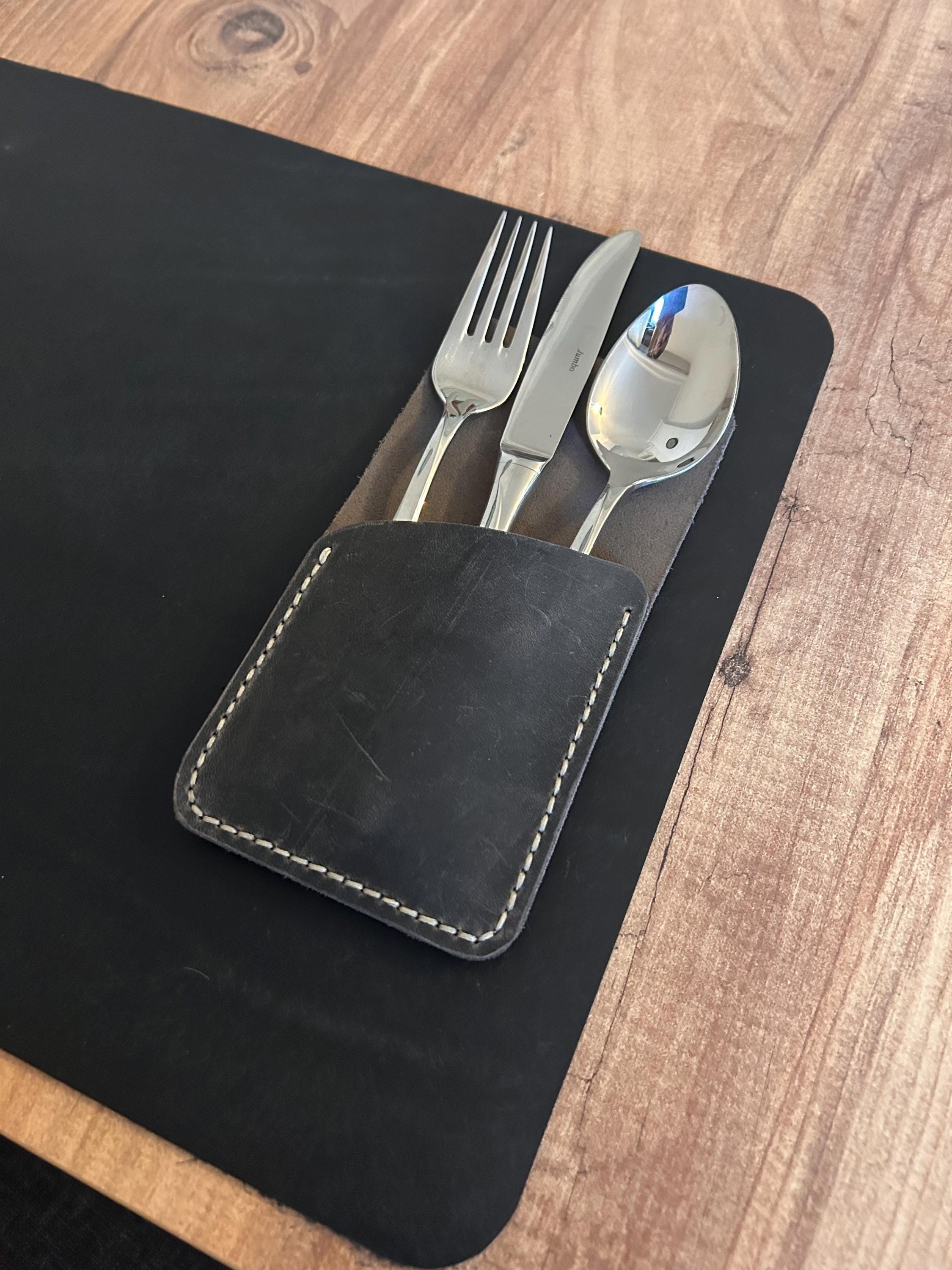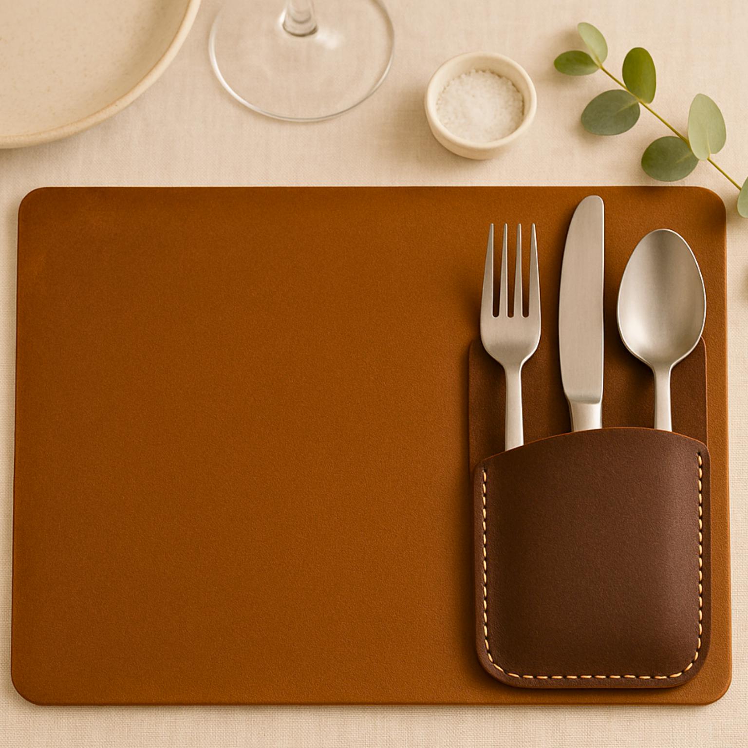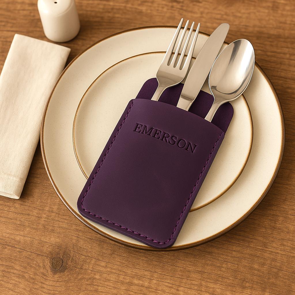Add elegance to your table setting! This personalized leather cutlery pouch is handcrafted from 100% genuine leather for a perfect balance of style and durability. Ideal as a housewarming gift or for upscale restaurant presentations.